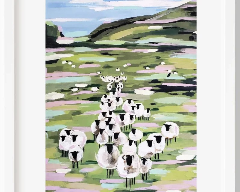 I love the texture of the landscape, from the colorful meadow stretching to the sky on the horizon. I interpreted the sky as both a horizon and seascape, and together, the meadow, sky, sea, and flock of sheep reminded me of some coastal regions of Iceland – one of my favorite places in the world.